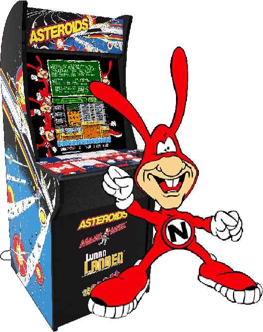 The Noid manipulating a 4th generation Asteroids arcade to play his stupid Noid game.