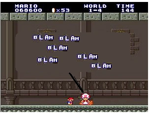 Blah blah blah is what Toad says to Mario whenever he beats Bowser in Super Mario Bros. Some people think that Toad is really saying "Thank you Mario but our princess is in another castle", but it doesn't really matter. Blah blah blah has been mentioned in many games since.