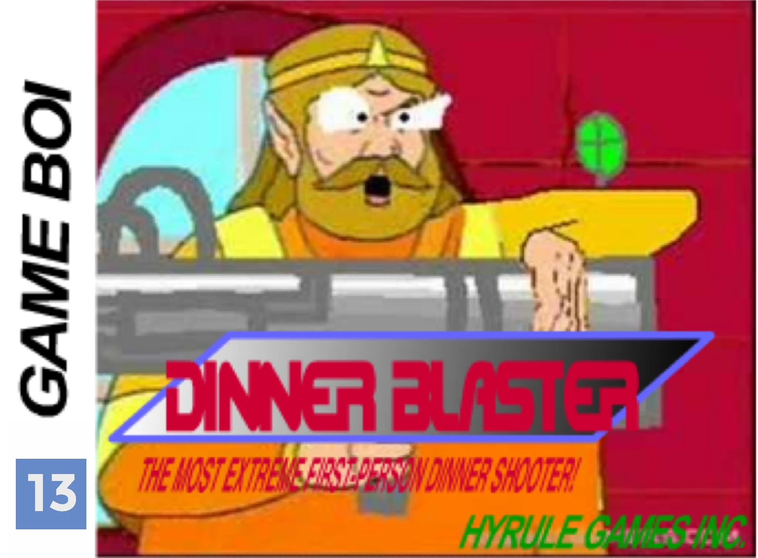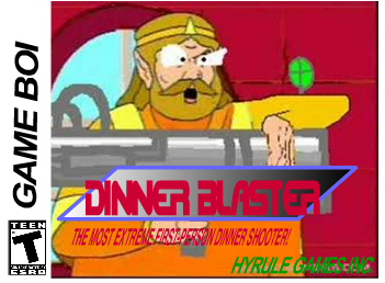 Dinner Blaster is a shame on the Shame Boi. It is a handheld first-person (occasional rail) shooter shame made by The King of Hyrule, developed by id Soft and Nintendo, and published by Hyrule Games Inc., which features the King himself as the main protagonist, in an epic shooting battle against Bowser.