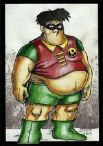 Fat RobinFatman's sidekick and best friend. His B button move is a fat swipe, and his midair A button move is his ability to fly for 8 seconds - continually flying will allow the player to gain altitude until Fat Robin gets tired and falls back to the ground. Fat Robin is unlocked by clearing Meme Island as Fatman. |