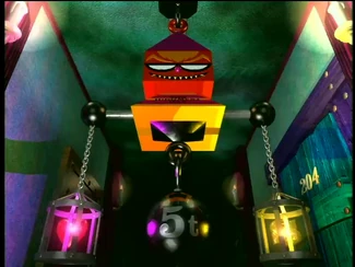 Appearance-wise, Judgment Boy has a humanoid face with orange-red skin, a pink nose, sharp teeth, and glasses. His hair is blond, and he has a hat-like structure that attaches to a hook that holds him up. Off of each of his arms is a chain that has a cage at the end. On the left is a heart (which represents empathy, or love), while on the right, there is a piece of gold (that represents selfishness, or money). When you make a decision to him, he'll drop one of them and give you a (usually snarky) reply.
