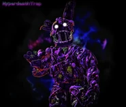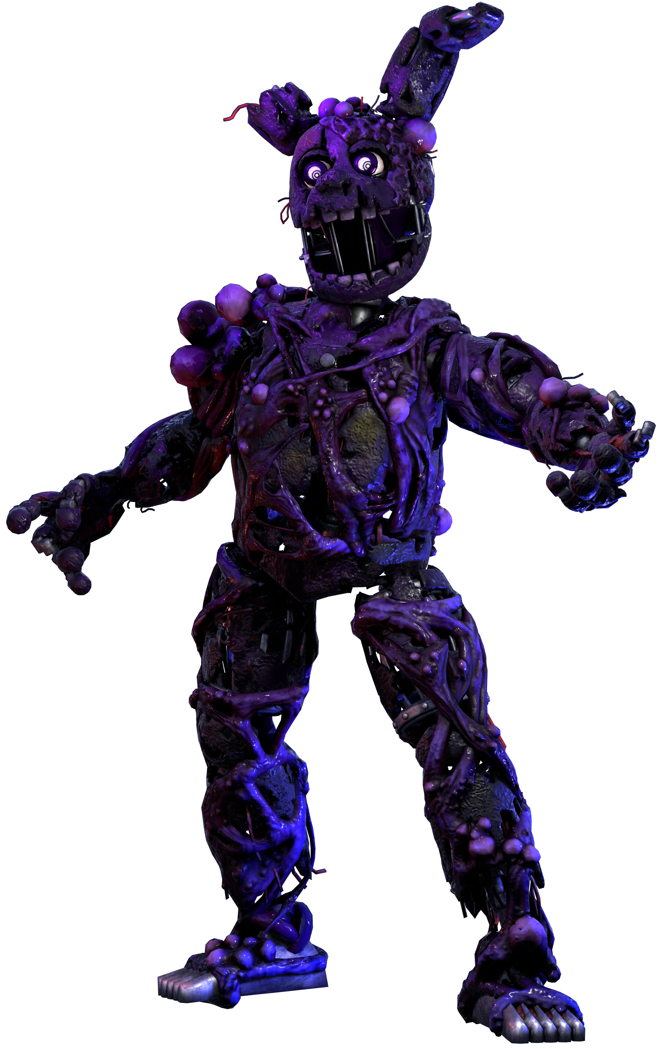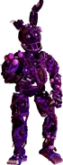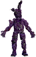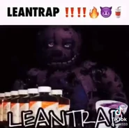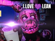 Lean-Springtrap, or just Leantrap is the result of Springtrap wanting to be purple again like in his Purple Guy days and jumping into the Mean Lean Machine Springtrap having WAAAAY to much lean and becoming invincible in the process. Like William Afton, he's purple. The lean has caused the suit to mold, and the spirit of a killer to corrupt to that of an obsesser for lean, though this is probably a good thing. The liquid's dankness also makes him immune to the suit's weaknesses of fire, fire flower, and blue fire.