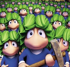 Lemmings are minions and creations of the evil Teletubbies. They are also known for stealing public domain music. The Lemmings are actually rather powerful, as they were made by the Teletubbies. They can shoot Energy Blasts, Blow Stuff Up, and they can control smells. They are not very smart, though, as if their leader makes a mistake, they can all end up getting harmed.