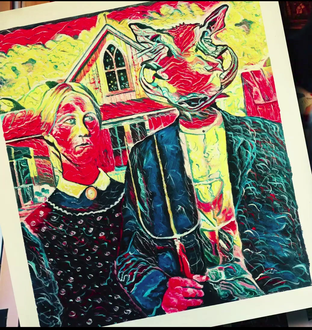 The American Warthog consists of a painting about three feet tall and 1.5 feet long, however when floating it stands at eye level depending on the entity it is with. The painting itself depicts a farmer and his wife, but the farmer has the head of a warthog. The painting also uses quite vivid colors that may confuse the viewer if stared at for too long.