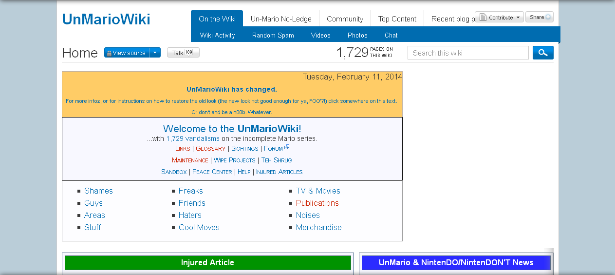 The UnMarioWiki was created back in May of 2006. UnMarioWiki was to MarioWiki as Uncyclopedia was to Wikipedia, except they made theirs with lots of fanon elements like with "haters"—guys who either hated Mario, were Wa-Guys made by the Wa-Machine, or who were just evil or evil clones. They even had their own UnMarioWiki Mascots, people not associated with Mario but were important to their universe, like parodies of Bill Cosby, Ronald McDonald, and even their own Evil Guy. (Two of which have had their pages ported directly to here). They even innovated off of Uncyclopedia's games (.co .com) into more of a "choose your own adventure" type style in UnMarioWiki: The Game, which had great influence on ours. Truly it was a new and exciting time to be on the platform. The UnMarioWiki started out small, but it grew! Then it didn't grow so much. Then it grew a lot! Then it grew with spam...