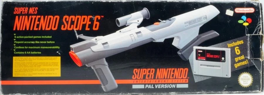 The worst gun to come out of Mr. Nintendo's buttocks of hell, the Super Scope is essentially a rocket launcher that doesn't shoot rockets. Only one model has surfaced, after Mr. Nintendo ate too much Zapper-flavored Taco Bell. Does it even shoot?